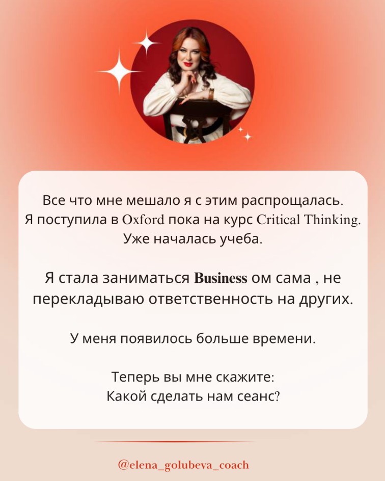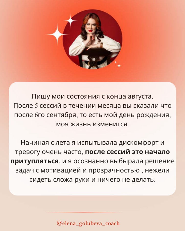 Недавно одна из моих клиенток поделилась, как после наших сессий начала ощущать лёгкость и вдохновение, которых давно не было. Изменилось её внутреннее состояние и бизнес сразу откликнулся. Она с лёгкостью убрала токсичных людей из окружения, стала больше доверять себе и своему восприятию.