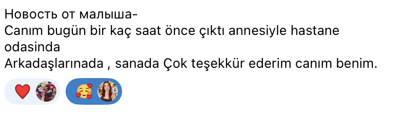Новорожденный малыш в Турции. После родов были обнаружены проблемы с дыханием и его поместили в реанимацию. После начала нашей групповой работы пришла новость, что малыша перевели в палату. И эта же новость на турецком языке приведена ниже от близких малыша.