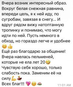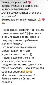 У меня была клиентка, у которой было тяжёлое заболевание. Она не всё ела, не всё ей можно было есть и делать. Так вот после нашей сессии психосоматики и энерготерапии онлайн (она была из другой страны), она наелась пельменей, которые запрещала себе есть долгое время.